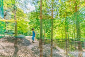 森の空中で跳ねて遊ぼう!大人気の巨大ネットアスレチック「ファンモック」は、混雑時に入場制限があるため事前予約がおすすめです。