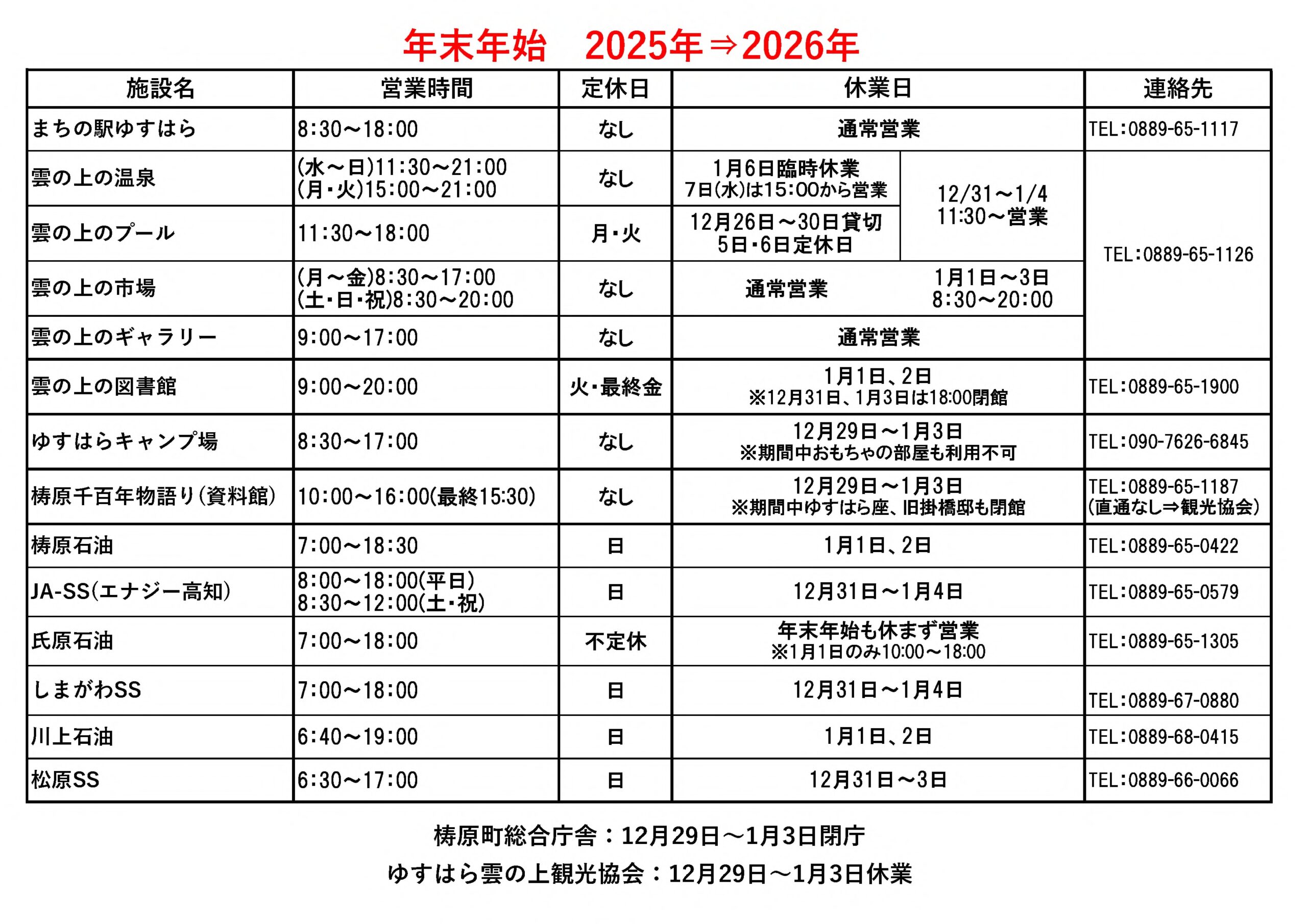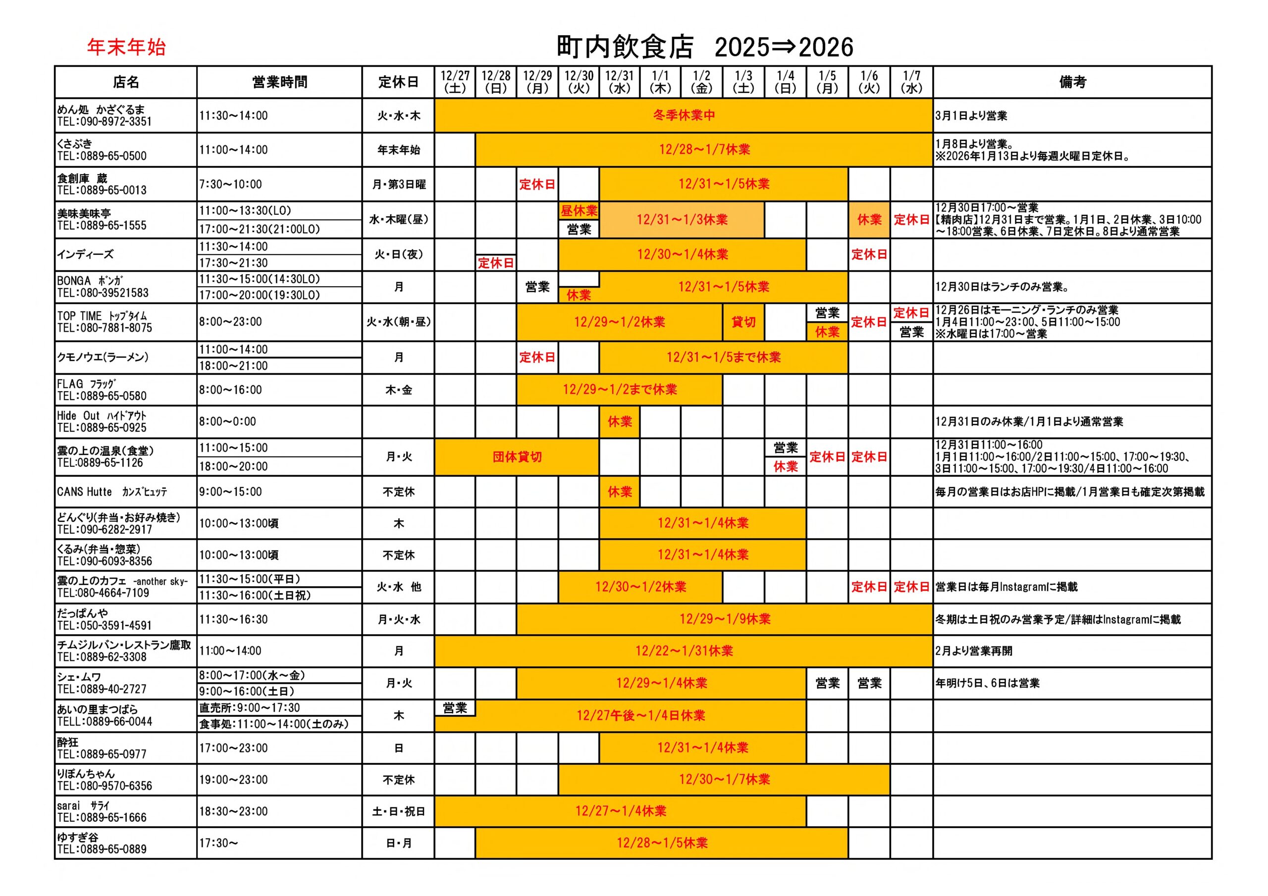 町内の飲食店やガソリンスタンドなどの年末年始営業予定について下記表をご確認ください。
