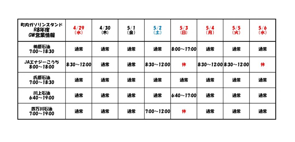町内飲食店およびガソリンスタンドGW営業について
