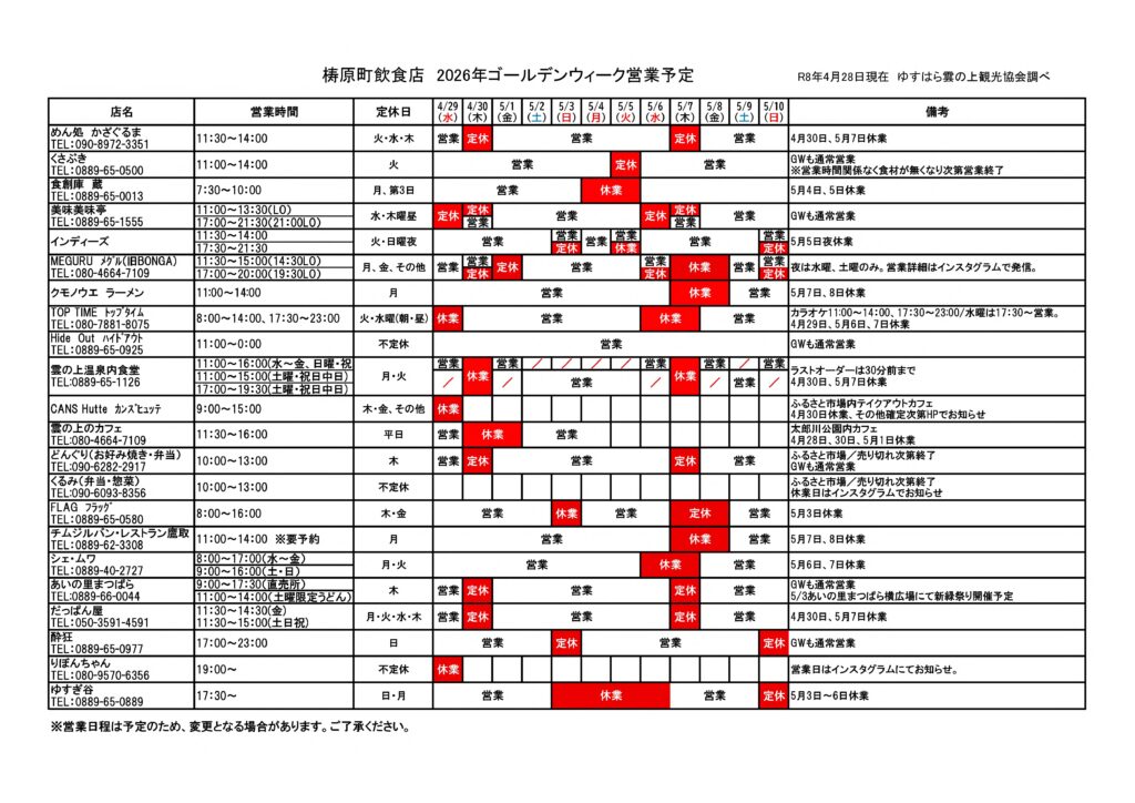 ゴールデンウィーク期間中の町内飲食店・ガソリンスタンドの営業情報を一覧にまとめました。